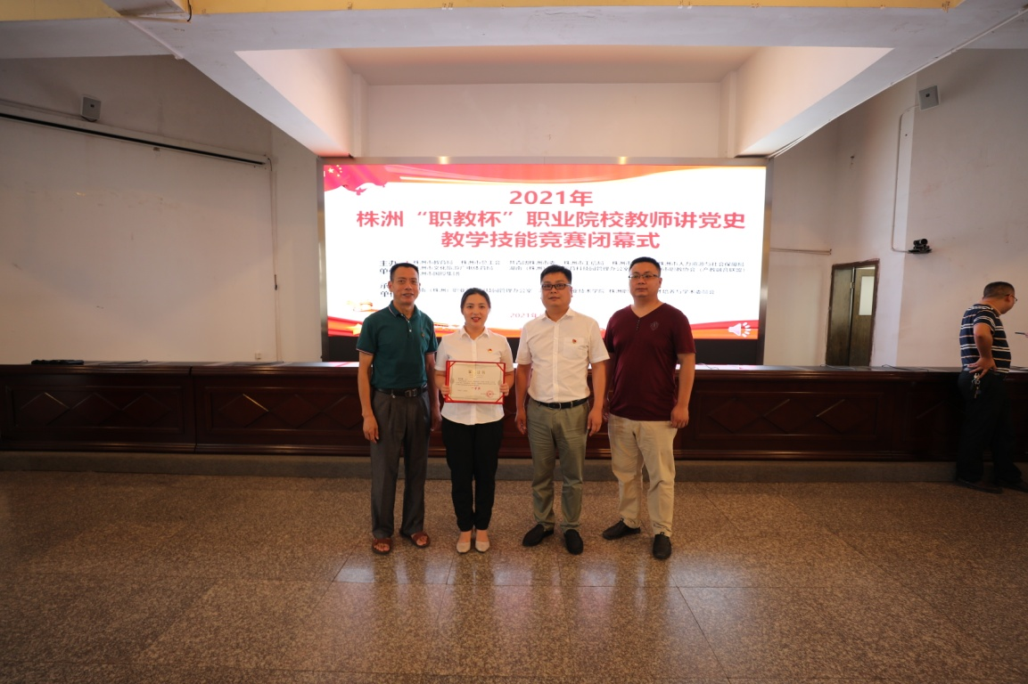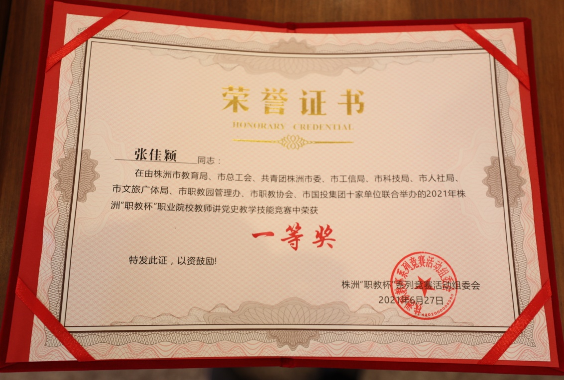 6月27日,在2021年株洲“职教杯”职业院校教师讲党史教学技能竞赛中,8868·体育建筑装饰系教师张佳颖荣获一等奖,并被授予株洲市“五一劳动奖章”。