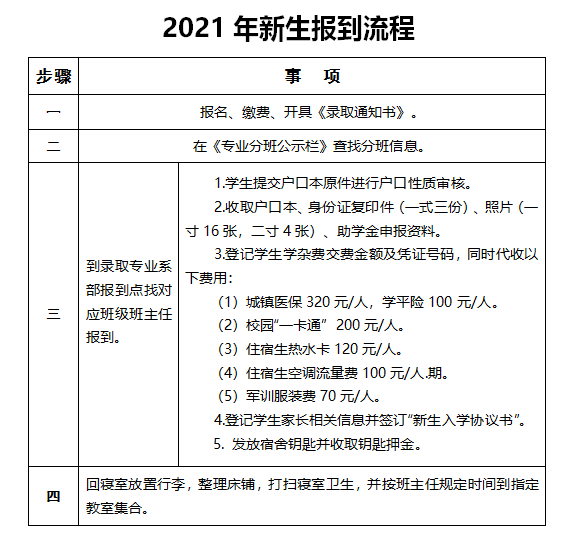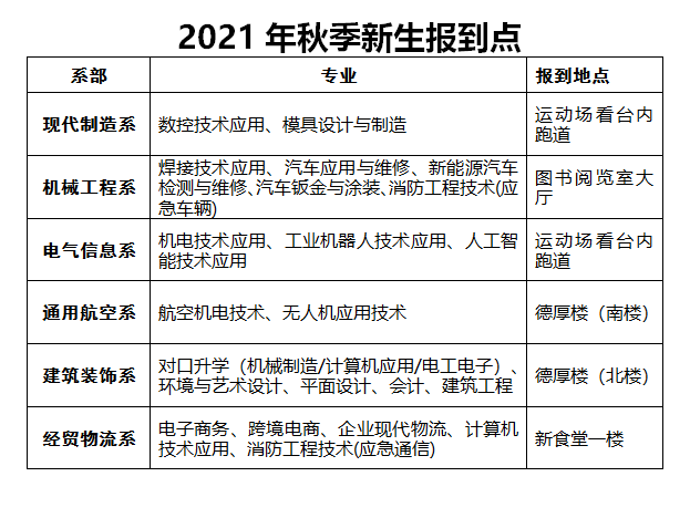1、现将《2021年秋季新生分班花名册》(点击下载)予以公布,请各位新生及家长查阅,如专业信息有误,请与招生办罗老师联系13973325641。9月11日、12日来校报到时,请按录取专业到对应系部新生报到点找班主任报到即可。