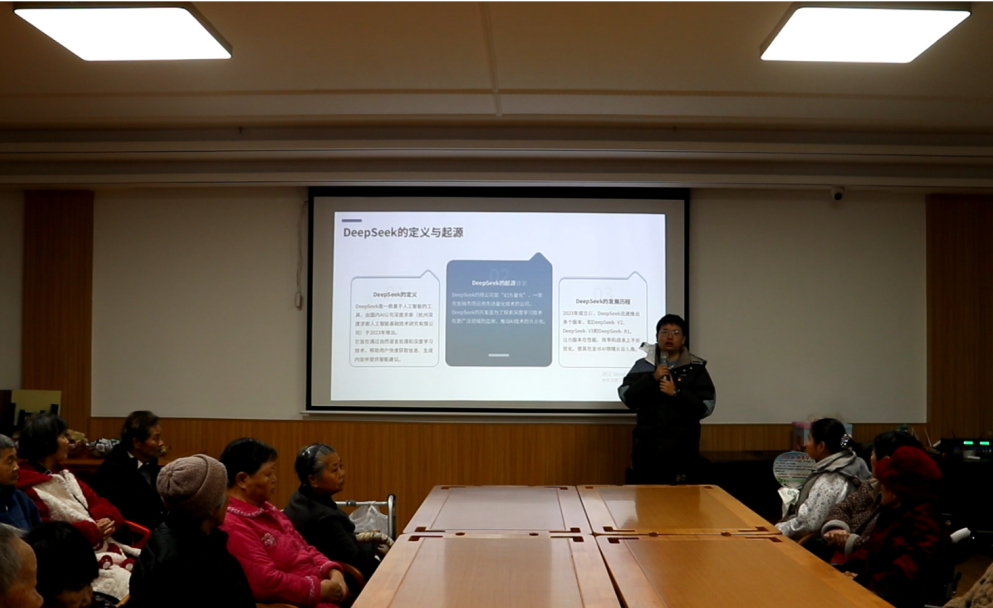 在温情互动的同时,师生团队依托电工专业特长,对老院房间内进行插座、灯具等安全隐患排查,并协助整理院内环境。在劳动结束后团总支书记周禹锡老师特别为老人和护工科普人工智能技术应用,通过演示DeepSeek模型,展示了一键生成大字版新闻摘要功能,帮助老人快速获取天气、节日等实用信息;护工们则体验了智能营养搭配服务,输入现有食材即可获得菜谱建议与营养分析。(电气工程系供稿)
