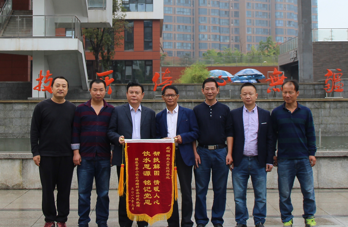 9月27日,醴陵市茶山镇石均塘村村支两委、株洲市驻村帮扶工作队一行6人冒着淅沥秋雨、带着印有“帮扶解困,情暖人心;饮水思源,铭记党恩”的锦旗来到8868·体育,感谢我院在驻村扶贫工作中对石均塘村给予的大力支持与帮助。市级联点领导、8868·体育院长陈洪星代表8868·体育接过沉甸甸的锦旗,感慨地说:“这面锦旗不仅是对我们扶贫工作和扶贫队员成绩的肯定,更是对我们今后工作的激励和鞭策,我们将继续履行好联点单位职责,发挥表率和带动作用,让脱贫帮扶更加精准长效,让群众信服,让群众满意。”寥寥数语,简短朴实,却鼓舞人心。随后,宾主双方在教学楼前合影留念。(党政办 供稿)